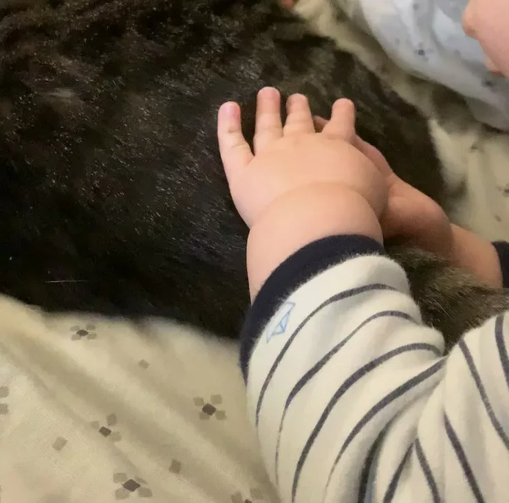 En décembre l’année dernière, notre petit bout avait alors environ 3 mois. Déjà alors, il posait ses mains sur le pelage de notre félin Lucky. Depuis, notre petit bout a eu un an le mois dernier. Quant à son intérêt pour nos deux chats, il grandit chaque jour.